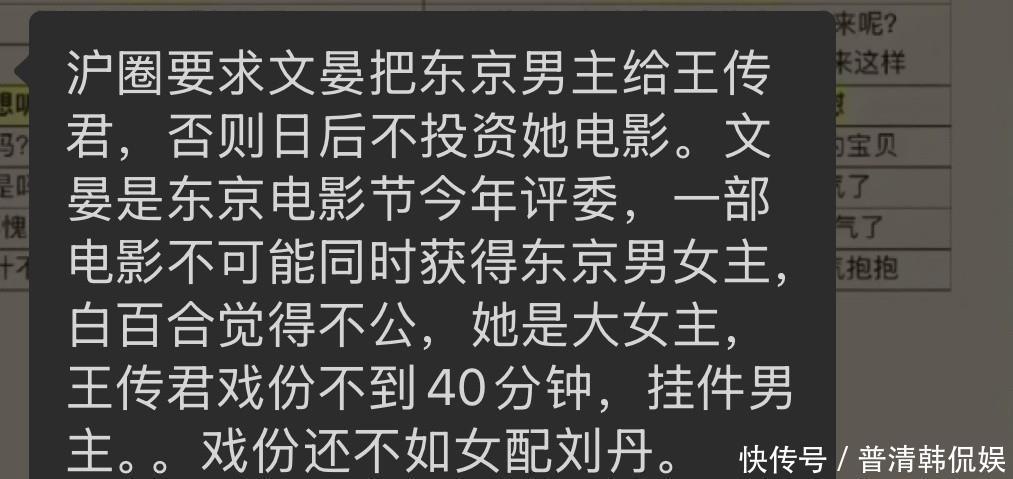 据说是因为王传君凭借《春树》拿了东京影帝,这部电影白百何是女主。沪圈要求文晏把东京男主给王传君,否则日后不投资她电影。文晏是东京电影节今年评委,一部电影不可能同时获得东京男女主,白百合觉得不公,她是大女主,王传君戏份不到40分钟,挂件男主……戏份还不如女配刘丹。