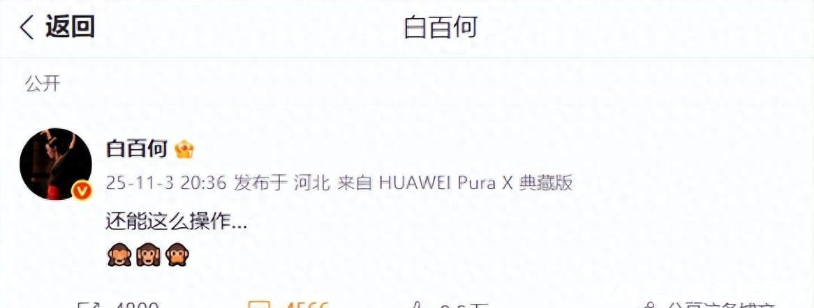 11月3日夜间,白百何突然发了一个不知所云的状态:还能这么操作……